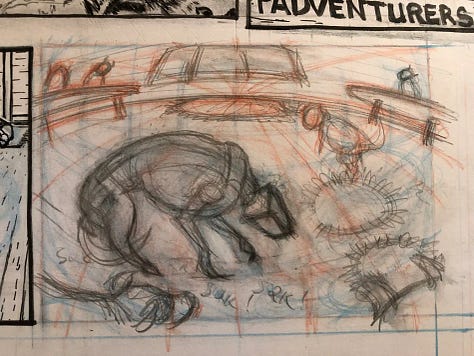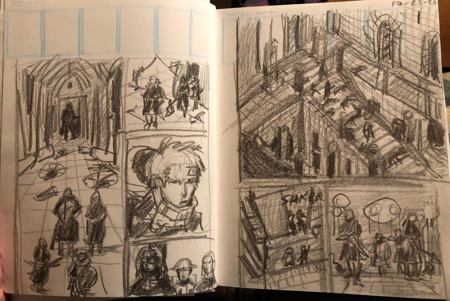 I found a cool way to make comic thumbnails. I have a fat lead mechanical pencil (1/2” thick) that I use for gesture drawing. I thought it was way too big to make thumbnails, but I tried it on a letter size sketchbook and it works great! At this size, I can capture just enough as to figure out what the image is, but not add detail.