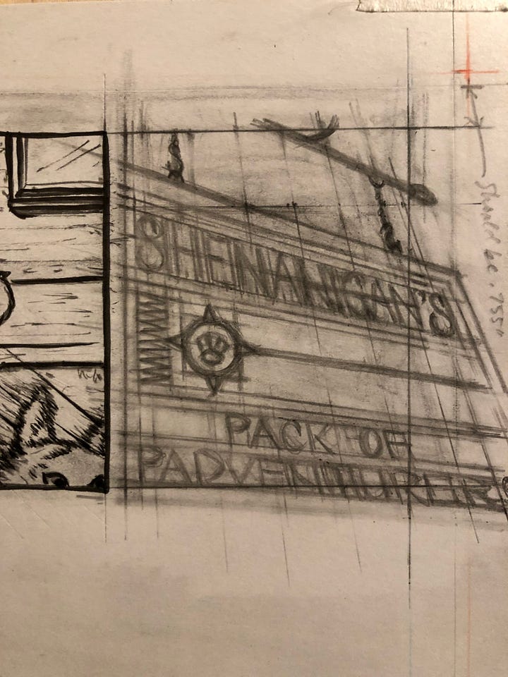 Image A - Shenanigan’s Pack of Padventurers guild sign pencils. Good practice working w/ perspective grids (although it would’ve simple to distort it if I did it digitally).