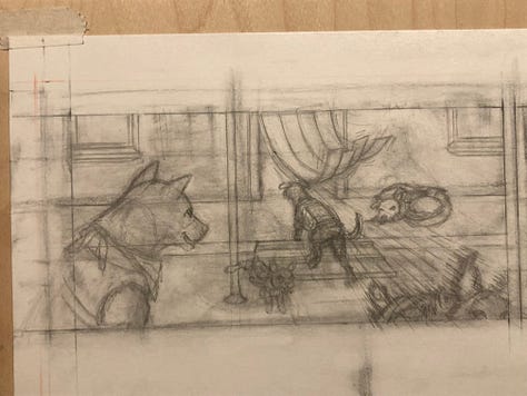 Image A - Roughs for page 2 panel 1 of my comic. Lupin at the entrance of Shenanigan’s adventuring guild.