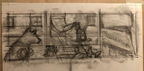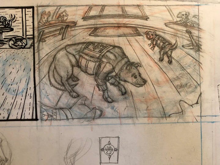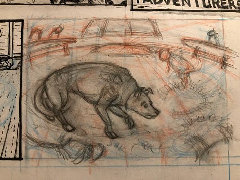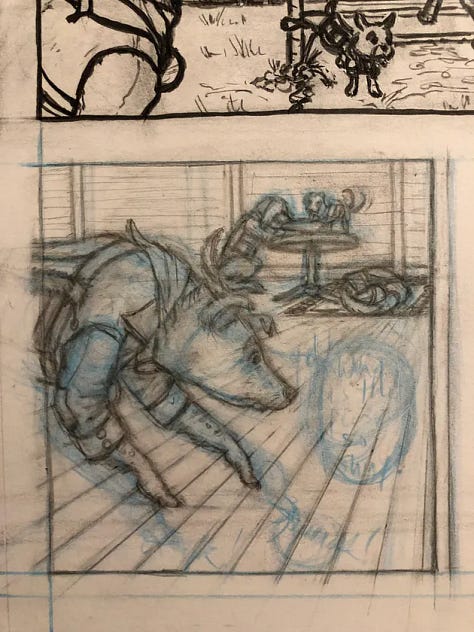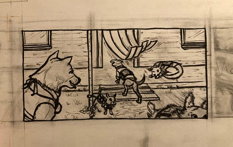 Image B - But later, I made a few notes for the notan thumbnail for page 2 of my comic. Need to scale panel 4 more narrow to have room for full body of Gus Gus in panel 6. Also a reminder to have clear foreground, mid ground, & background (added a dog foreground silhouette to panel 4). But this should be enough to start the pencils on an 11×17 bristol sheet now.
